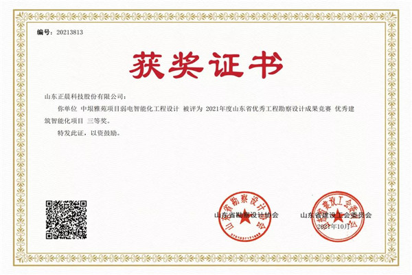 近日,山东省勘察设计协会、山东省建设工会公布的《2021年度山东省优秀工程勘察设计成果竞赛结果的通知》中,中欧体育(中国)官方网站股份设计的中垠雅苑弱电智能化项目获评优秀建筑智能化项目三等奖,有力的助推了城市勘察设计水平的提升及城市建筑品质的优化。